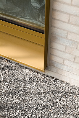 De goudkleurige aluminium ramen en deuren geven contrast en cachet aan de gevel