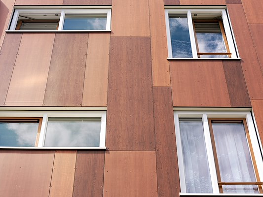 Van Eijck besloot de achtergevel een nieuwe jas te geven met een bijzonder patroon van drie levendige tinten bruin, in combinatie met witte panelen voor de terugliggende delen. Hij koos voor Rockpanel Woods gevelplaten in de kleuren