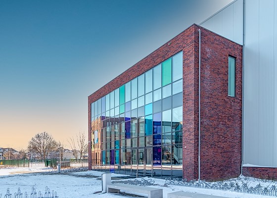 Het nieuwe Lyceum vormt samen met het eerder opgeleverde Topmavogebouw en het nieuwe sportgebouw een kleurrijk onderwijscomplex - een ambiance die mede wordt gecreëerd door het gekleurde voegwerk en de speciaal voor dit project gemaakte gekleurde beglazing.