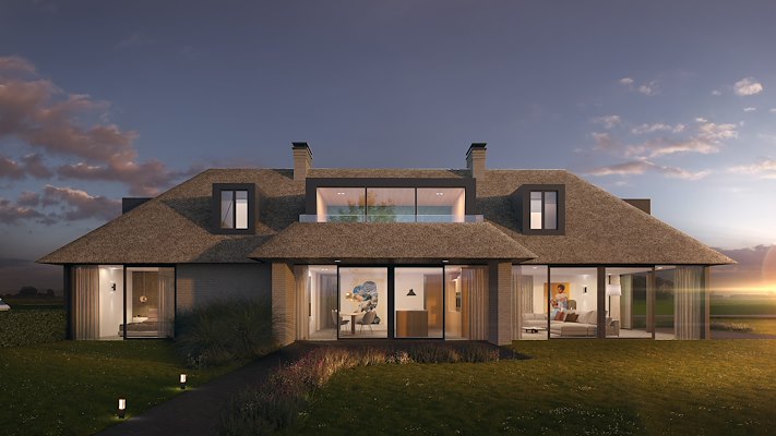Modern vormgeven landelijke woning met bijgebouw. De woning heeft een gesloten karakter aan de staatzijde tevens de noordzijde. Aan de zuidzijde opent de woning zich naar het wijdse Zeeuws Vlaamse landschap. De woning is uitgevoerd in gekeimd metselwerk, aluminium kozijnen en een rieten kap. Naast de woning staat een bijgebouw in de vorm van een traditionele vlaamse schuur.