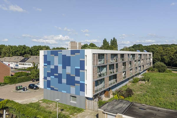 . Dessing: “We hebben uit het ruime Rockpanel assortiment vijf tonen uitgezocht per flat. Kleuren die perfect zijn afgestemd op elkaar en op de kleuren die al aanwezig zijn bij de verschillende flats. Daarnaast zijn de kleuren van de vier flats ook onderling op elkaar afgestemd. De gevels variëren nu van een flat met blauw-grijze tinten tot een flat met groene en een flat met rode tinten.”