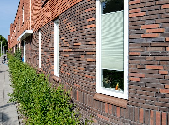Ook met de klassieke baksteenarchitectuur grijpt het plan terug naar het verleden. Dat zie je aan de betonnen ornamenten, mooie metselwerkverbanden en de details in hekwerken. Deze elementen komen terug in het hele plan en brengen daarmee eenheid in het blok met twaalf verschillende woningtypes.