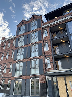 Op de gevels van de woningen sieren aluminium louvreluiken welk decoratief zijn. Het grootste deel van de luiken aan de twee appartementen zijn functionele schuifluiken en elektrisch bedienbaar als zonwering.