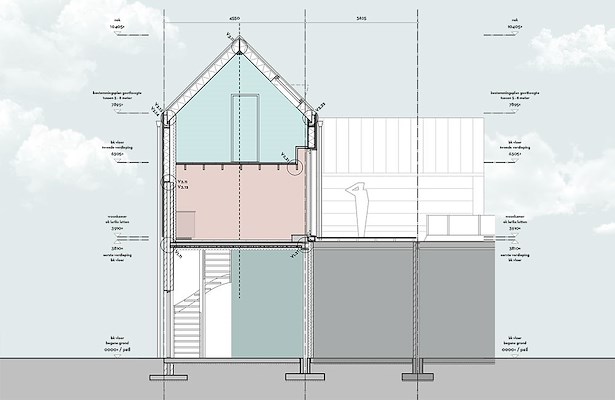 Het nieuwe huis opent zich naar buiten, naar het erf op het dak. Het sluit zich wat meer af voor de drukte van de straat en houdt het klimaat beter buiten. De leefruimte is gegroeid en een grote glazenpui opent het huis voor een zee van licht en eindeloze wolkenpartijen. Zo hebben we licht, leefruimte en privacy gerealiseerd in een eigenwijs en ruimtelijk volume. Boven de stad en er tegelijk middenin. Een verborgen plek, persoonlijk en idyllisch.