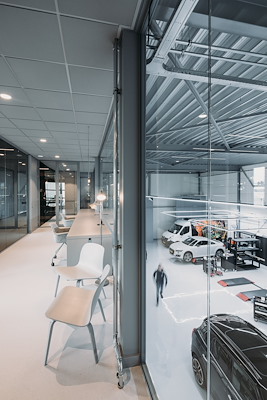 Een goede akoestische scheiding was praktisch gezien essentieel. De transparante connectie tussen beiden delen zorgt niet alleen voor een gevoel van saamhorigheid bij de medewerkers, maar biedt tevens klanten een kijkje in het intrigerende werkproces.