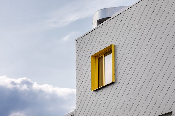 De combinatie van lichtgrijze leien en gele raamkozijnen zorgt voor een speelse uitstraling