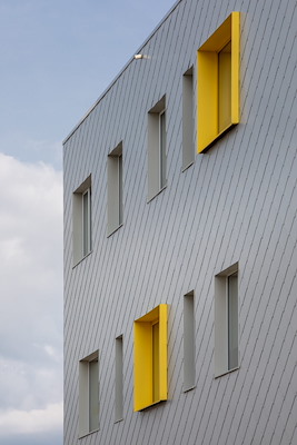 is afgestemd op een nieuwer deel van het bestaande schoolgebouw en vormt een contrast met het oudste deel van de school. Door de combinatie met de felgele ramen straalt het rust maar ook speelsheid uit, wat dan weer perfect past voor een basisschool.