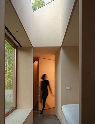 In plaats van ruimtes en kamers af te scheiden met vaste wanden, heeft Orange Architects een flexibele woonruimte bedacht, die is opgezet rond een meubelblok in het midden. Door opvouwbare en verplaatsbare elementen te gebruiken, kunnen bepaalde ruimtes desgewenst worden afgescheiden. Zo wordt de uitsparing voor het bed in het midden ’s nachts een comfortabele slaapkamer en worden de douche en wastafel tot een eigen badkamer.