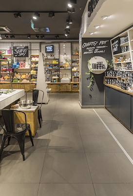 Materialen met dezelfde boodschapVoor de vloeren in de ruim veertig winkels van Lush wereldwijd worden keramische tegels van Mosa uit de Core Collection Terra-serie gebruikt. Er is gekozen voor de grotere tegels (60x60 centimeter) om de vloer de uitstraling te geven van een keramische huid in plaats van een tegelvloer. Gumery bezocht het hoofdkantoor van Mosa in Maastricht om de tegels en productieprocessen beter te leren kennen en om te kijken of Mosa als leverancier bij Lush paste. “We vonden de look-and-feel van de tegels geweldig, maar wat de doorslag heeft gegeven om voor Mosa te kiezen, was het bezoek aan het hoofdkantoor en de fabriek in Nederland. We kregen een rondleiding op het terrein, we bezochten de ontwerpers achter de collectie, we aanschouwden het productieproces en de grondstoffen die tot het eindproduct leiden, en we luisterden naar hun verhaal over duurzaamheid en de ongelooflijk strenge kwaliteitscontrole van iedere tegel. Zo werd het ons gaandeweg duidelijk dat Mosa een toegevoegde waarde is voor zowel de uitstraling van de Lush-winkels als de visie waar ons merk voor staat. We voelden dat Mosa een boodschap uitdroeg en er werd ons met veel passie verteld over hun commitment ten aanzien van het milieu, de werknemers en de klanten. Dat was de reden dat we voor Mosa hebben gekozen. Dat we trouw blijven aan Mosa komt doordat zij onze verwachtingen hebben overtroffen, waardoor we er alle vertrouwen in hebben dat ze hoogwaardige producten kunnen leveren met strakke levertermijnen (just-in-time). Dit is voor ons als snel groeiende internationale onderneming heel geruststellend.
