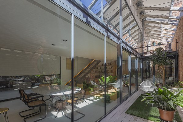 Estudio B76 designed its new headquarters in an industrial warehouse built in the 50s. They kept and revealed reinforced concrete trusses and the perimetral walls made of bricks. The design focuses on using glass and steel to maintain the industrial atmosphere.