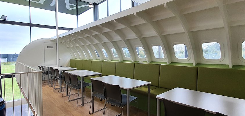Bijzonder in het interieur is het vliegtuig dat centraal in het atrium is geplaatst. Het is bij binnenkomst direct duidelijk welke opleiding dit gebouw huisvest. In het vliegtuig bevinden zich studentenwerkplekken.