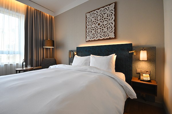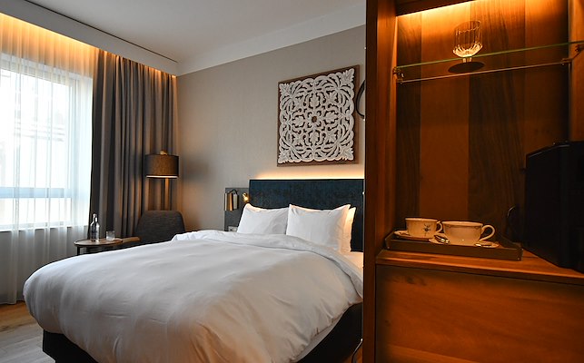 Een transformatie van statig bankgebouw naar lifestyle hotel is geen gemakkelijke opgave. Bovendien is een hotel pas rendabel als de gasten komen, een korte bouwtijd is altijd het streven. Verantwoordelijk voor de technische installaties was het Haagse bedrijf Steegman Installatietechniek B.V., dat al vele jaren ervaring heeft in de hotelsector. Hoe groter het hotel, en hoe meer kamers, des te belangrijker het is om een strakke planning aan te houden. Het voordeel bij veel kamers, die qua voorzieningen en elektra dezelfde structuur hebben, is de kracht van de herhaling. Om de vaart erin te houden koos Steegman voor al het schakelmateriaal in de kamers voor JUNG Stekerbaar (plug+go) in A CREATION, waar nodig uitgevoerd met brandwerende inbouwdozen. Voor dit grote project heeft JUNG de A CREATION ramen speciaal gelakt in de kleur champagne.