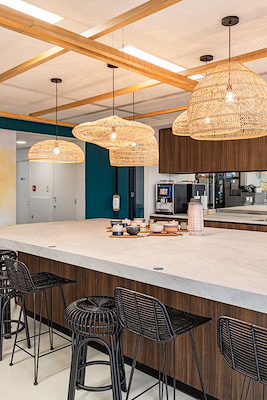 En zo’n tropisch sfeertje kan ook eigenlijk geen kwaad, op een plek met veel hoogbouw en weinig groen eromheen. Zo gebruikten we veel organisch materiaal in het ontwerp. Verschillende (hang)stoelen zijn gemaakt van rotan en dankzij de golfbewegingen in het tapijt van het Deense merk Ege krijg je echt een strand-achtig gevoel. En dat sluit weer aan bij de strandtentconstructie die we bij sommige werkplekken optuigden. Ook de verschillende mospanelen zorgen voor een relaxte en speelse sfeer waar de werknemers van Dole op hun fonkelnieuwe werkplek fijn kunnen samenwerken.
