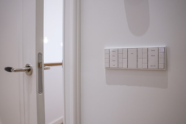 De wandzenders zijn bedrukt om overzichtelijk te maken welke tasterknop welke verlichting bedient. De basis van het eNet SMART HOME systeem is gelegd door Patrick zelf, door de wandzenders te programmeren met de eNet Server. Zo legde hij op elke wandzender, altijd rechtsonder, een ‘alles uit’ knop vast. Hiermee kan alle verlichting van een hele etage worden uitgeschakeld. Eveneens heeft elke wandzender een tasterknop voor het aanschakelen van verlichting op de volgende etage, zodat de bewoners nooit in het donker komen te staan. Ook is er op elke wandzender een tasterknop ingericht voor scènes waarin verschillende lichtpunten en dimniveau’s gecombineerd kunnen worden. Op deze ‘lichtscèneknop’ kunnen de bewoners zelf verschillende lichtpunten instellen met behulp van de app.