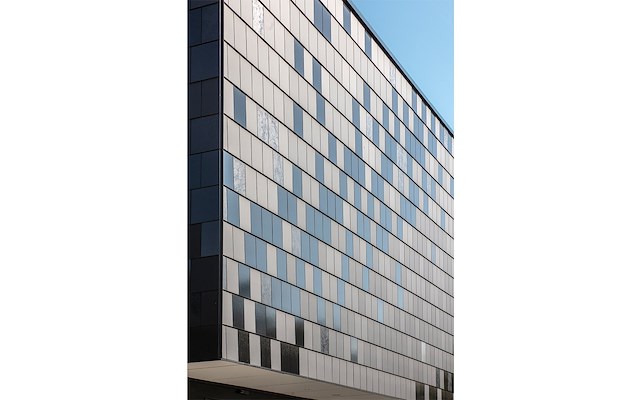 Wat zijn we nu enthousiast over het eindresultaat. De zwarte buitengevel zit als een natuurlijke huid vol reliëf om het gebouw heen. Als het denkbeeldige huidpatroon van een slang zijn de Trespa-platen met wisselende structuren (textuur) tot klein formaat gezaagd. Dit patroon verbindt alle gevelonderdelen. Met de ‘huid’ vertellen we het verhaal van de materialen die binnen ontwikkeld worden. In dat concept gaan we terug naar de natuurlijke oorsprong van het materiaal van Trespa, waaronder voornamelijk (70%) hout. Je ziet dit nu terug in de uitstraling van de nieuwbouw, Door de combinatie van de zwarte huid en witte lamellen heeft het gebouw bovendien een hele sterke en eigen identiteit.