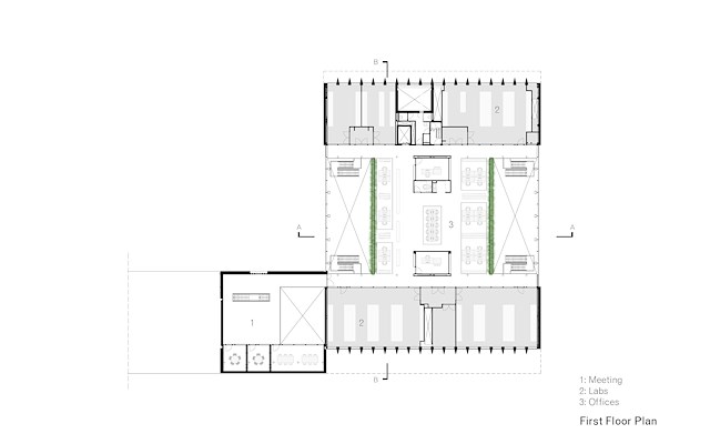Van buitenaf zie je meteen wat er in de laboratoria gebeurt. We gaven de ‘labvleugels’ in het gebouwontwerp een prominente plek aan de buitengevel. De lamellen en het overstek houden de directe zoninval tegen. Binnen hebben medewerkers hun werkplek in het hart van het gebouw. Op elke werkplek kijk je dankzij dubbel hoge vides en daklichten met veel daglicht uit over de twee ‘labvleugels’. Het maakt optisch en functioneel bovendien één geheel van de kantoorruimten, laboratoria en klantruimten. Het interieur en exterieur lopen in elkaar over. Binnen komen Arpa-, Trespa- en Westag materialen terug in de afwerking van meubels, deuren en wanden. Samen met Trespa ontwikkelden we daarvoor nieuwe patronen. Bovendien komt het huidpatroon van de buitengevel binnen terug in gerecycled vilt. In de muren komen geïntegreerde magnetische whiteboards van Homapal. En in een deel van het meubilair zijn draadloze opladers van Formica verwerkt.