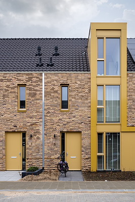 Enkele woningen, waaronder de twee-onder-een-kappers, ‘reageren’ op de omgeving doordat hun bijzondere dakkapellen als ogen zijn gericht op het ernaast gelegen dijklandschap.