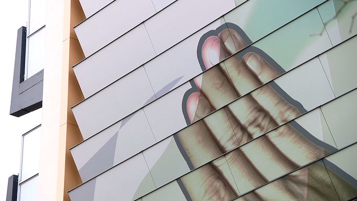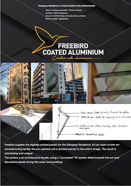 Freebird heeft de afbeeldingen van GOMAD op een aluminium rol geprint en voorzien van een UV-bestendige clearcoat. Vervolgens heeft Freebird het gevelpaneel met honingraatkern geleverd zodat dit geassembleerd kon worden in voor-gemonteerde "bakken" die vervolgens op de gevel gemonteerd werden.