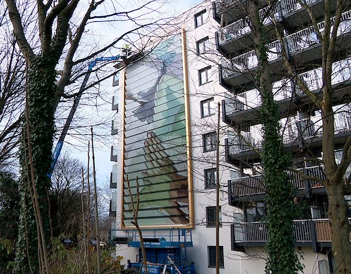 "Wonen Limburg" wilde beide gevels verfraaien en tevens verduurzamen. GOMAD Urban Art Studio heeft drie ontwerpen gemaakt waarvan de bewoners er twee mochten selecteren. ZigZagSolar ontwikkelde een gevelsysteem waarbij hun PV-paneel op de zon gericht staat en het gevelpaneel met de afbeelding naar de begane grond.