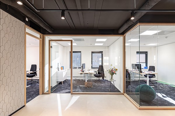 De kantoren hebben verschillende diepten, door de getrapte glaswanden. Hierdoor ontstaan er plekken en kantoren met meer en minder privacy. Het middengebied krijgt door de grote glaswanden veel licht en is bedoeld voor overleg en ontspanning. We hebben nauwkeurig geïnventariseerd wat in het bestaande pand hergebruikt zou kunnen worden. De installaties is op efficiënte wijze aangepast en verbeterd.