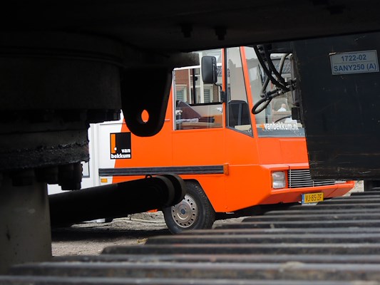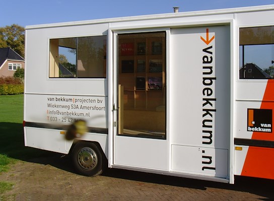 De oude spijkstaal wagen, die bekend is van de SRV-man, heb ik omgebouwd tot rijdend kantoor voor Van Bekkum Projecten. Deze rijdt van bouwplaats naar dorpsplein om kopers te ontvangen. De wagen kan als een van de weinigen bereden worden met een normaal rijbewijs B, topspeed: 85km/u.! Er is verwarming aanwezig en 230V voor de koelkast, binnenverlichting en de laptop. Ook is er een complete keuken met water en kooktoestel ingebouwd. In het wandrek worden de verschillende projecten getoond, op het magneetbord worden de tekeningen opgehangen. Aan de buitenkant, net als op de oude SRV wagens, kliklijsten voor de aanbiedingen van dit moment!