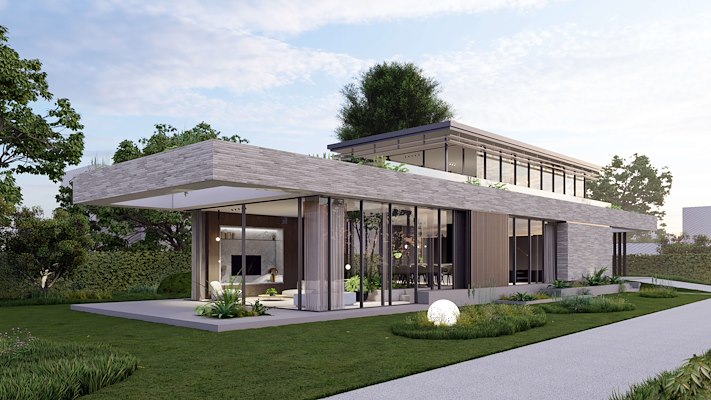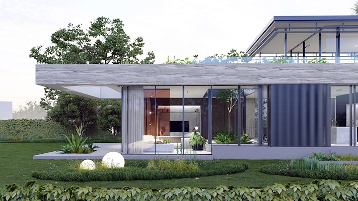 Door middel van grote glazen puien heeft elke kamer heeft een prachtig uitzicht op de omliggende omgeving. Maar ook de verschillende ruimtes staan in open verbinding met elkaar. Hierdoor ontstaan er prachtige zichtlijnen door de gehele woning. Blikvanger is de skybar op de eerste verdieping.
