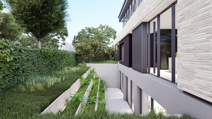 De master bedroom en de riante badkamer zijn in de kelder gepositioneerd. Ook hier zijn grote raampartijen geplaatst waardoor er volop licht de ruimte binnenkomt maar de privacy tegelijkertijd gewaarborgd blijft.