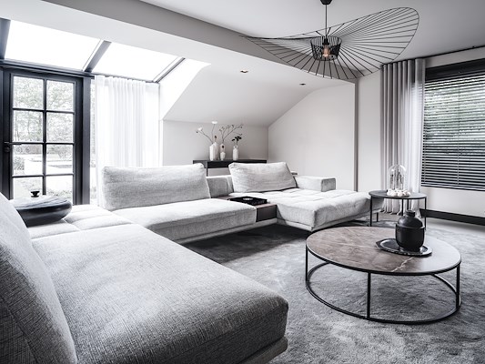 Mariska enlarged the home’s entrance hall, in which the corridor along the stairs leads to the private domain of the residents and the double steel pivot doors grant access to the home’s arresting living space. At the front, she unleashed her imaginative expertise by designing a warm and stylish custom-made kitchen, which is, owing the open character of the home, connected to the inviting dining area and the richly furnished living room. Mariska applied a serene colour palette and natural materials such as wood, steel, linen and velvet. The works of art, bespoke lighting plan, organic shapes and artistic fixtures add adventure and depth to the interior.