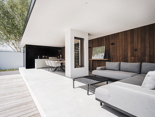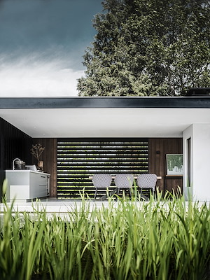 Studio Mariska Jagt gave the villa a modern, luxurious look by embellishing the exterior with white stucco, dark panels and dormer windows. The windows installed on the left side allow in abundant natural light and provide wonderful views across the property’s spacious grounds. On the right-hand side, the renowned agency, in collaboration with Barbasso, designed an eye-catching pool house—naturally, fitted with every modern convenience—and a swimming pond, which allows the clients to experience a wonderful holiday feeling at home. They can reach the luxurious outdoor space through the double doors of their suite. In the pool house, we find a well-appointed outdoor kitchen, elegant dining area and spacious lounge area. The see-through fireplace, which acts as a room divider, creates a refuge in the sumptuous space. The pool house is situated on a concrete podium, lending the bespoke object additional value and prestige. The horizontal view through the wall behind the swimming pond allows the residents to also enjoy a living, rural painting from this position. The purple art object—like the elevated pool house—completes the striking outdoor space.