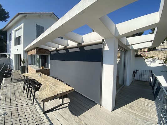 This privileged location provides a consequent amount of sun all year long. For better comfort, the owners chose to use the O-box system for both elegance and flexibility. The RTS motor facilitates its use. In addition, the fabric used is a Polyscreen type possessing the IMO certification, suitable for use in saline environments.