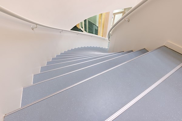 'Deze stalen trap strak afwerken met LiquidDesign, dat kan niet iedereen', vervolgt Nils. 'Wij hebben veel disciplines in eigen huis, waaronder traprenovatiespecialisten die bijvoorbeeld ook cursussen geven.' Nils legt uit dat ze in een grote ruimte in de Sportwaard eerst mdf-platen afwerkten met LiquidDesign en in twee lagen aflakten. Na droging zaagden ze hieruit de traptreden en stootborden. Wijzend op de tribunes boven de sportzaal: 'Hetzelfde hebben we gedaan met de staande borden op dit bordes. Tot slot, net als op de trap, antislip-hoekprofielen erop en klaar.'