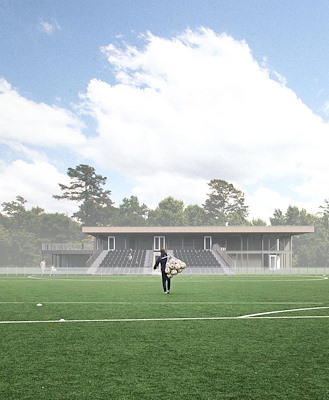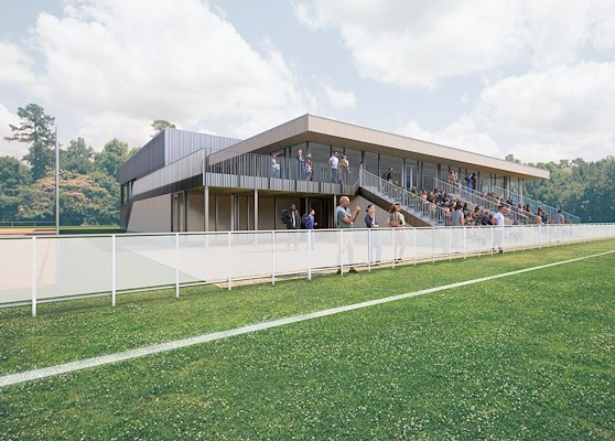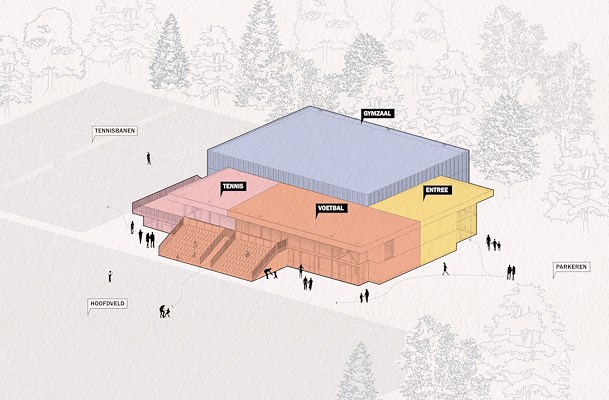 De vier open hoeken van het alzijdige gebouw geven de verschillende gebouwdelen elk een eigen gezicht. De gezamenlijke entree richt zich met een dubbelhoge glazen pui op de toegang van het terrein. De voetbalclub is gericht op de velden met een tribune en panoramische kantine. De tennisclub kijkt uit op de tennisbanen vanaf een zonnig dakterras en de gymzaal krijgt noorderlicht en uitzicht op de bomenrand.