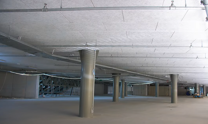 Naast de Dewin kantplank voor de gevel hebben wij ook de Dewin akoestische houtwolcementplaat voor de parkeergelegenheid, fietsenstalling en kelder geleverd. Deze plaat heeft een zeer goede invloed op het akoestisch comfort in de ruimte, maar draagt ook bij aan de goede BREEAM-score. De platen zijn geleverd met een facetrand rondom en gespoten in de kleur wit, wat een mooi afgewerkt beeld oplevert.