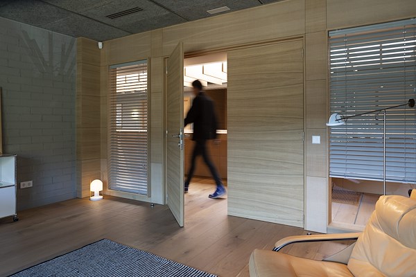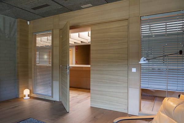 - Aluminium Venetian blinds in Smokey Grey finish are used for the internal glassed partition to provide intimacy in working spaces.