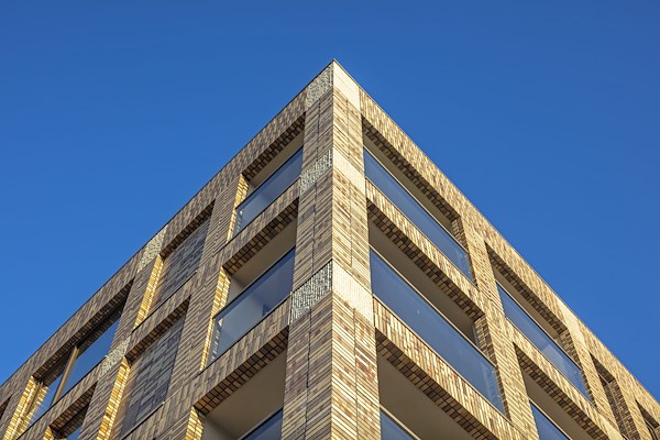 De Hagemeisterstenen zijn in staand en liggend tegelverband toegepast. De zelfdragende prefab geveldelen zijn in de fabriek met donker voegwerk nagevoegd.