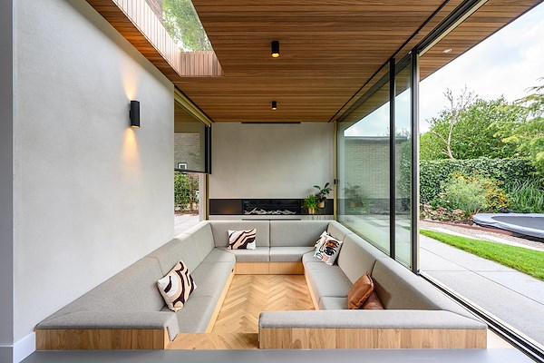De zitkuil is omgeven door MethermoXL producten. Aan de ene kant is de woning voorzien van een schuifpui die de hele lengte en breedte van deze kant van de woning in beslag neemt. Door het minimalistische design en het slanke profiel wordt de gevel volledig voorzien van glas. Door de schuifpui te openen wordt de binnenruimte één geheel met de buitenruimte. Dit effect wordt nog eens versterkt door het feit dat de dorpel op één niveau ligt met de vloer. Zo wordt de buitenruimte een verlengde van de binnenruimte.