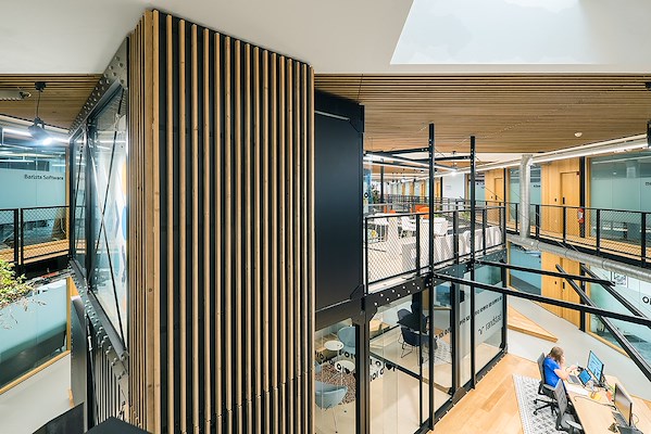 Sfeervolle houten toepassing nieuw kantoor.