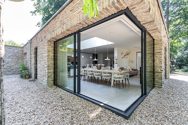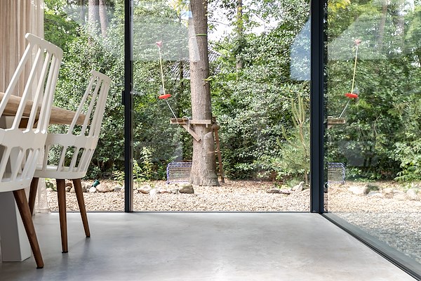 De aanbouw beschikt over een schuifpui. Deze pui is volledig te openen, waardoor er een open hoek gecreëerd wordt. Daarbij zorgt de grote opening voor een verbinding met de buitenruimte. Zo worden binnen en buiten één. Om deze verbinding te versterken, is de dorpel van de pui mooi weggewerkt en gelijkgemaakt met de vloer.