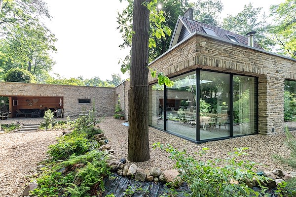 Een bosvilla in Apeldoorn is compleet getransformeerd. Het oorspronkelijke ontwerp is onder de loep genomen en er is een nieuwe getransformeerde villa ontwikkeld door middel van het toepassen van onder andere natuursteen. Het voorgaande ontwerp had kleine ramen, waardoor de verbinding tussen binnen en buiten wegviel.