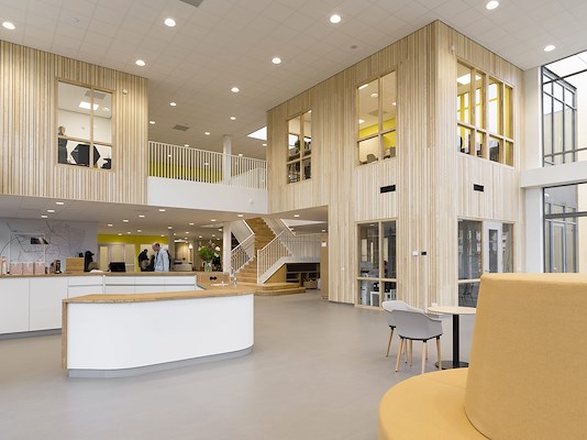 Het concept is consequent doorgevoerd van de wijk tot en met de inrichting. De maat en schaal van het gebouw sluiten aan bij de bebouwing in de omgeving. Binnen is het ontwerp verrassend afwisselend. Meerdere meubels zijn onderdeel van de architectuur, zoals de boekenwand die in de houten trap is geïntegreerd. Architect Braspenning: “Het houtgebruik ademt die sfeer van ontspanning die we nastreefden. Tegelijk zorgt het vele hout voor een prettige akoestiek in de school.” De huiselijkheid komt je al bij binnenkomst tegemoet. Bezoekers worden ontvangen aan de balie. De ontvangstruimte loopt door in de open keuken met bar en zitjes in de dubbelhoge aula. Vanuit hier heb je uitzicht op de verschillende buitenruimtes, de terrassen en gaanderijen.