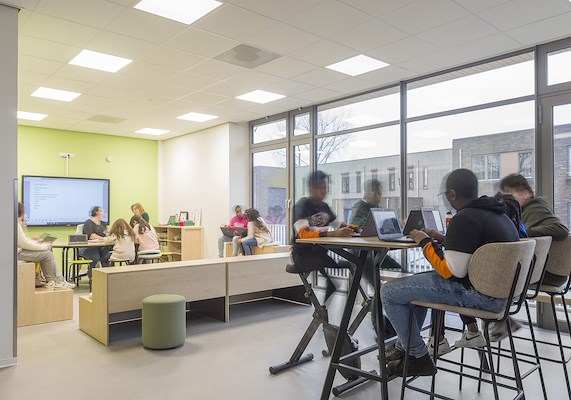 Het ontwerp past bovendien naadloos in de pedagogische visie van de school. Die is vernieuwend: er zijn geen traditionele lokalen. In plaats daarvan werkt de school met units van zo’n honderd leerlingen. Hier gaat KC IJsselmonde tegen de stroom in. Directeur Thomassen: “Je zou denken dat de kinderen in deze wijk structuur nodig hebben. Dat is ook zo. Maar klassikaal onderwijs zou ze op achterstand brengen. Juist deze groep willen we zelfredzaam maken en executieve vaardigheden bijbrengen, zoals plannen, concentreren, samenwerken, omgaan met emoties en leren leren.” De omgeving nodigt daartoe uit. De leerlingen werken in verschillende ruimtes en samenstellingen.