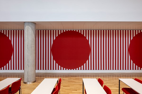 The Soft Cells panels, fitted to walls and doors, enhance acoustic quality and act as a key artwork element. Together, they form an expansive installation located inside and outside the auditorium. Upholstered in Casa, woven with Trevira CS yarns, the panels feature a deceptively simple combination of circles and Daniel Buren's trademark stripes in red and white.