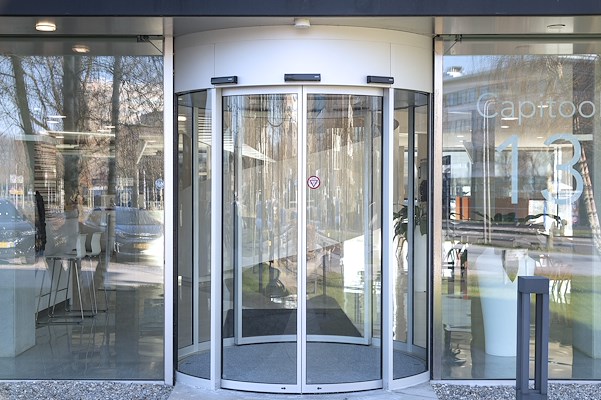 Doordat de Slimdrive SCR 40% meer openingsbreedte heeft dan een lineaire schuifdeuraandrijving wordt een mooie representatieve gebouwtoegang met grote lichtinval gerealiseerd door de glazen vleugels.