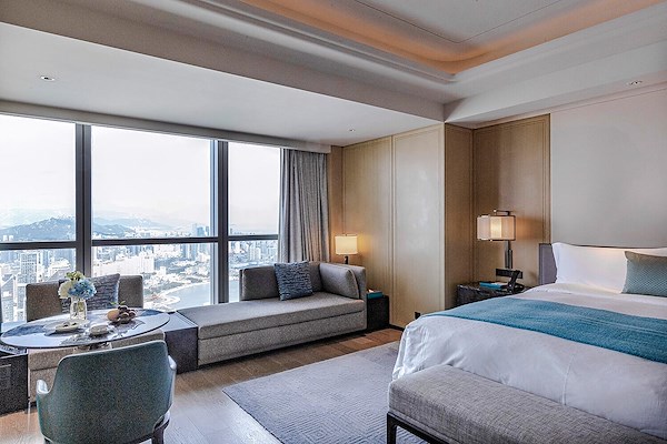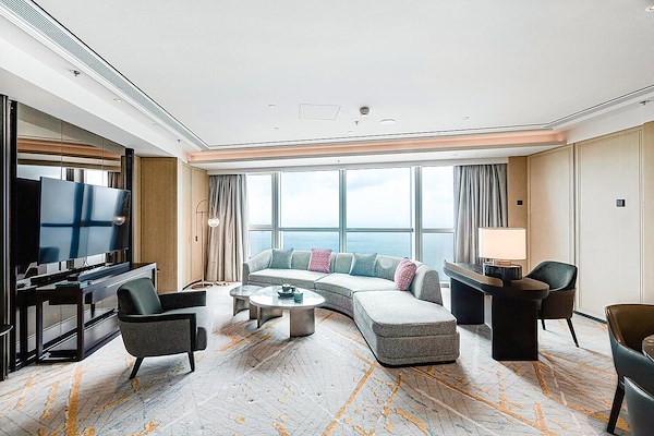 verdieping van de middelste toren van het complex. Het Haïtiaanse centrum bestaat in totaal uit torens, waarbij de middelste toren het hoogste gebouw is in de stad, met 369 meter. De locatie van het St. Regis Qingdao is dan ook ongeëvenaard. Alles bij elkaar heeft het hotel 203 gastenkamers en 30 luxe suites met uitzicht op zee. Het interieurontwerp is van Lim Honglian, een wereldwijd toonaangevende ontwerper van luxe hotels en oprichter van LTW Designworks uit Singapore. In zijn ontwerp combineert hij typische CI-elementen van het merk St. Regis met verwijzingen naar de plaatselijke cultuur en bouwgeschiedenis. Het houtsnijwerk met cameliabloesempatroon die als wandbekleding fungeren in alle kamers, geven een modern-elegante, maar tegelijkertijd traditionele, sfeer.