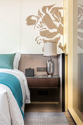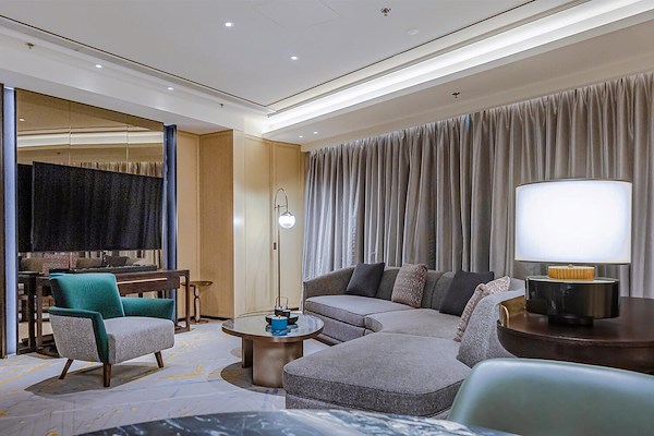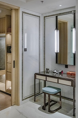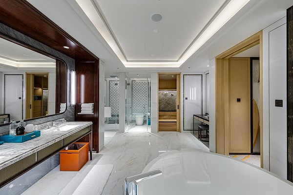 De exclusieve en hoogwaardige uitrusting van de kamers uit zich ook in de afwerking: voor de schakelaars en contactdozen is gekozen voor het JUNG programma LS 990 in Dark. Het schakelmateriaal van gelakt aluminium ogen niet alleen hoogwaardig maar voelen ook luxe aan bij het schakelen. De functies van het schakelmateriaal woorden in het Mandarijn en in het Engels gegraveerd. Zo levert ook JUNG een kleine bijdrage aan een esthetisch en comfortabel verblijf voor gasten van over de hele wereld.