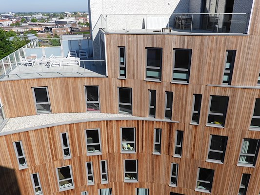 Poolen heeft ervoor gekozen om de zachtere ‘binnenwereld’ te voorzien van een daktuin als verbindend element tussen de twee gebouwdelen, en natuurlijke materialen, zoals hout. De robuustere ‘buitenwereld’ is opgetrokken uit metselwerk. Robuust maar aanraakbaar. Deze tactiliteit wordt mede veroorzaak door de speciaal voor dit project ontworpen lichte gevelsteen, die prima aansluit op de wit gestuukte loggia’s.