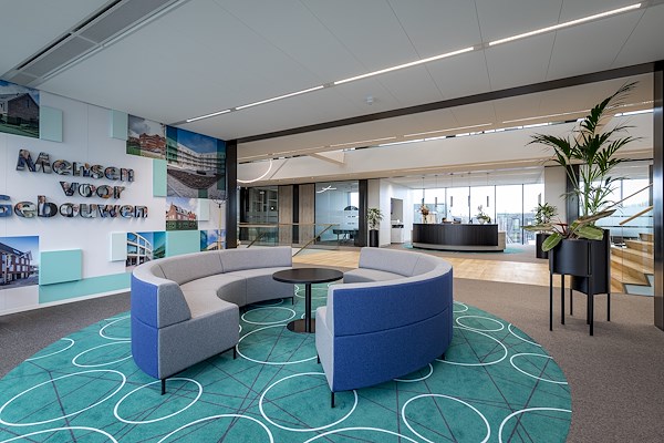 Een frisse, transparante en gezonde werkplek. Dat was het uitgangspunt van het ontwerp van RoosRos Architecten. “In het ontwerp kwam dit tot uitdrukking in een rustig ontwerp voor het interieur, maar met een aantal uitbundige accenten”, vertelt architect Ros. “Die accenten zijn bijvoorbeeld te zien bij de toiletgroepen, die als het ware verstopt zijn achter wanden in hout uitgevoerd, of bij de groene wanden op de eerste en tweede verdieping. Deze levende groene wanden dragen bij aan een gezonde werkomgeving.”