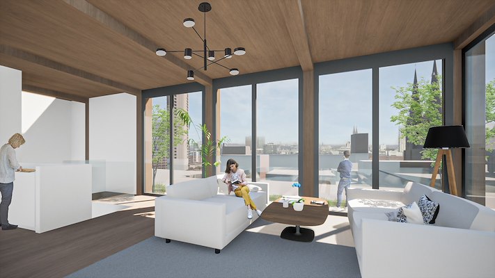 Het dakpaviljoen biedt ruimte aan bijzondere Maisonnette-appartementen en kraagt uit over de Jan van Lieshoutstraat. Hierbij ontstaan spectaculaire vergezichten over het omringende stadslandschap.