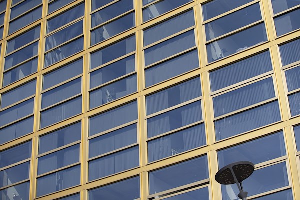 The golden façade plays with light. It incorporates horizontal sliding windows framing the horizon around the building and evoking the former horizontality of the original building.