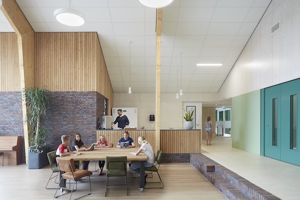 Het nieuwe kindcentrum herbergt OBS De Kronkelaar en kinderopvang Kids2B. Het verrees in Groot Bronswijk, een park waar voorheen een psychiatrisch centrum gevestigd was. Projectarchitect Wouter Stoer van Onix NL: ‘Een kindcentrum moet om te beginnen een gezond gebouw zijn; het moet licht en ruimte combineren met een fijne akoestiek, een prettig binnenklimaat hebben en een mooi uitzicht op bij voorkeur een groene omgeving. Dan heb je een plek waarin kinderen zich prettig voelen, net als hun begeleiders. Net zo belangrijk: het gebouw moet aansluiten bij de onderwijsvisie van de opdrachtgever; het moet de docenten in staat stellen het onderwijs te geven dat bij die visie past.’